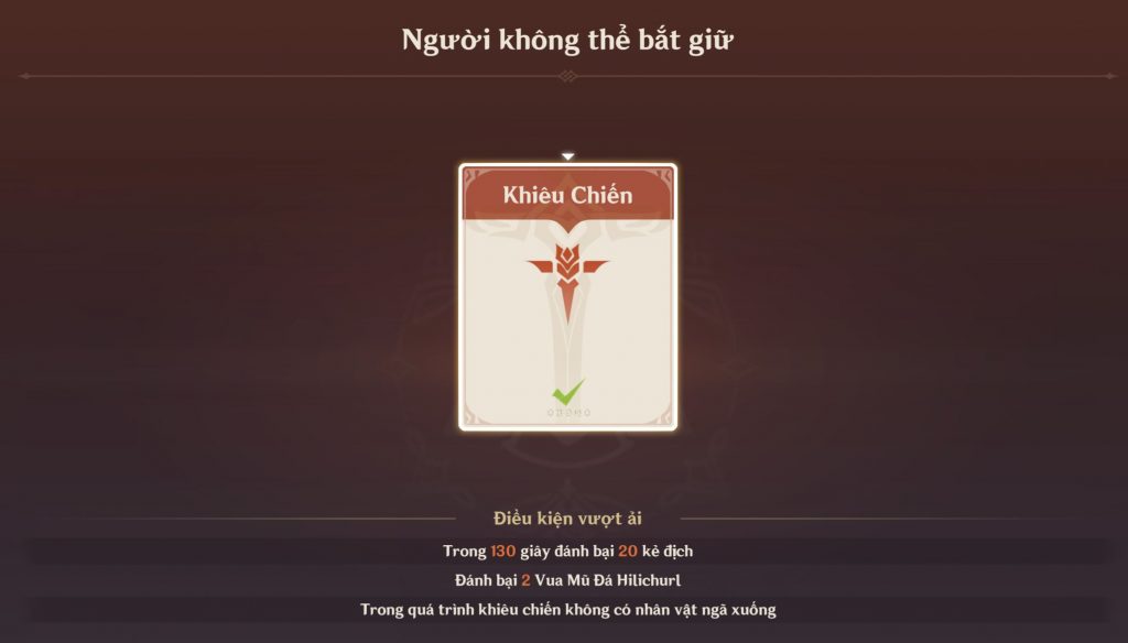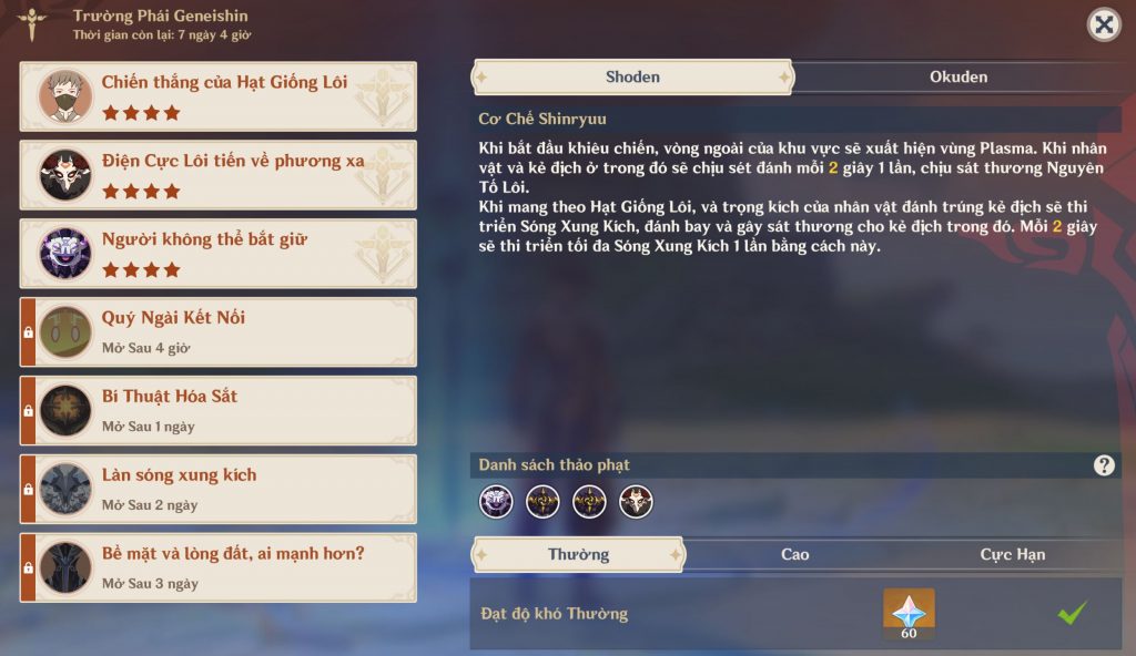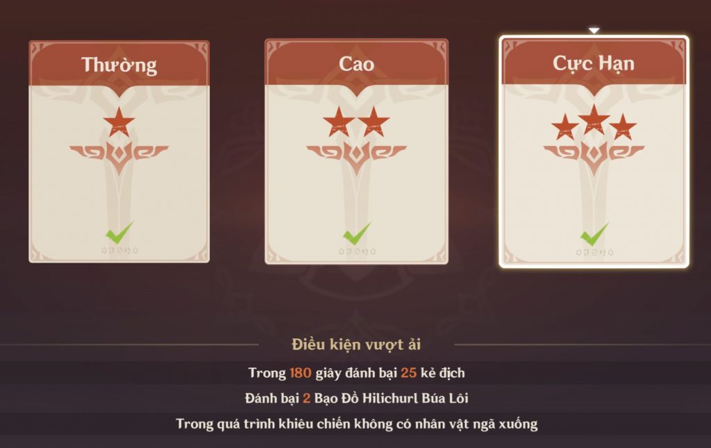 Chế độ Shoden – Cực hạn, người chơi phải đánh bại 2 Bạo đồ Hilichurl và đồng thời đánh bại 25 kẻ địch trong 25 giây.
